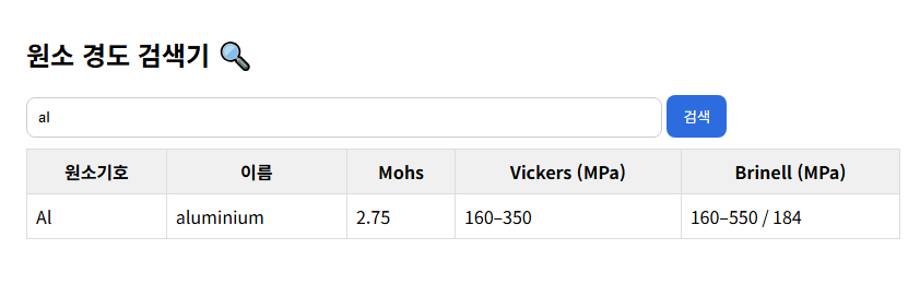 결과는 원소기호와 이름, 그리고 Mohs 경도와 비커스, 브리넬 경도까지 나옵니다.