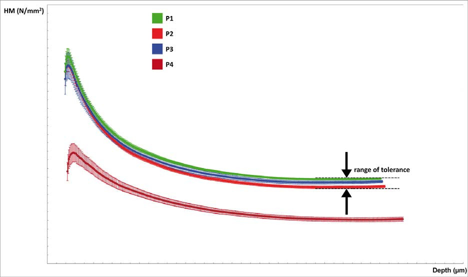 그림 2 : 렌즈 보호 코팅의 경도 측정 (마르텐스 경도). 시료 P4는 경도가 현저히 낮고 스크래치에 훨씬 덜 견딘 것으로 확인되었습니다 (샘플 제공 Rodenstock)