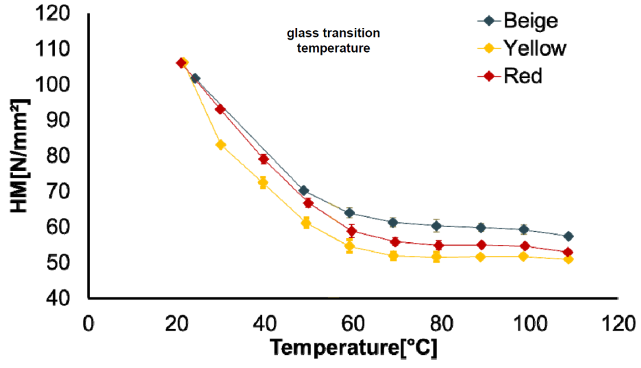그림 2는 서로 다른 온도에서 세 가지 샘플의 Martens 경도 (표준 편차 포함)를 보여줍니다. 세 가지 색상 모두 상온 (~ 20 ° C)에서 거의 동일한 경도 값을 가지지만 열이 가해지면서 상황이 변하여 색상 안료에 따른 영향을 보여줍니다.