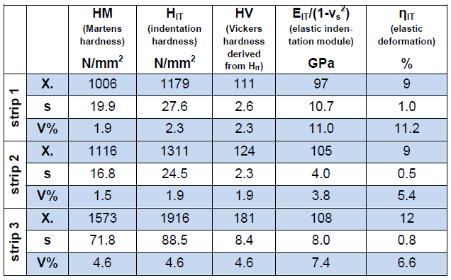 얇은 금속 호일의 기계적 물성은 나노인덴터 (DIN ISO 14577에 따라)를 사용하여 축정할 수 있습니다.