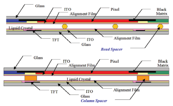 TFT LCD에 사용되는 가장 일반적인 종류의 스페이서는 비드 (Bead, 구형) 및 컬럼 (Column, 리소그래피에 의해 패터닝 된) 유형 스페이서입니다.