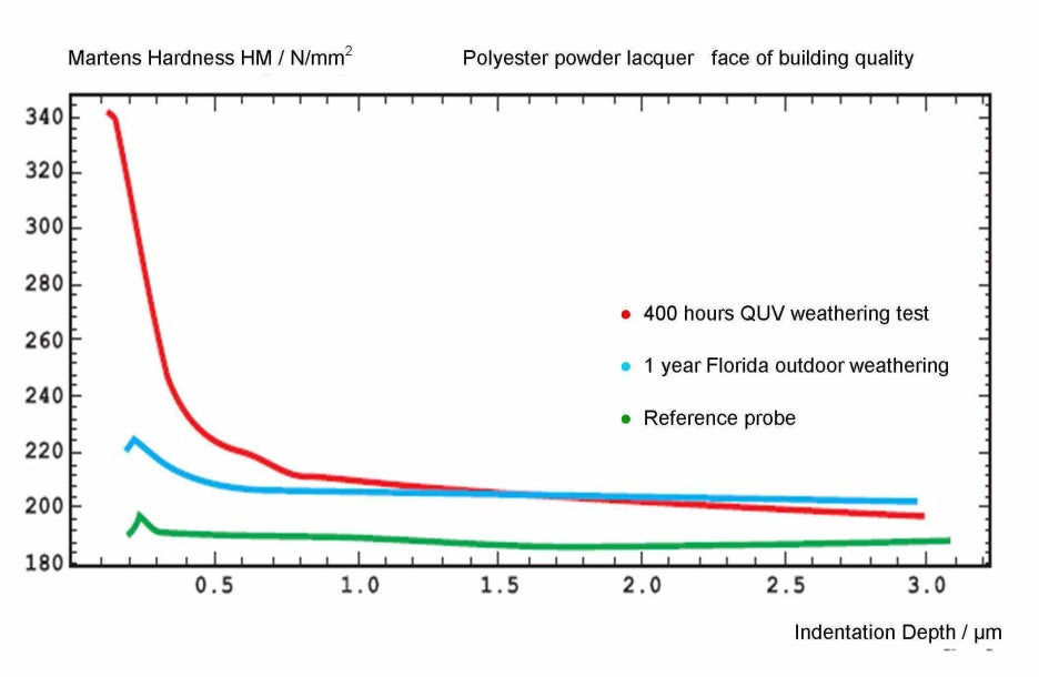 풍화에 노출되지 않은 기준 샘플 (녹색 그래프)은 표면에서 경도가 증가하지 않습니다. 플로리다에서 1 년 동안 야외에서 풍화에 노출 된 샘플은 표면 근처에서 약간의 경도 증가를 보여줍니다.